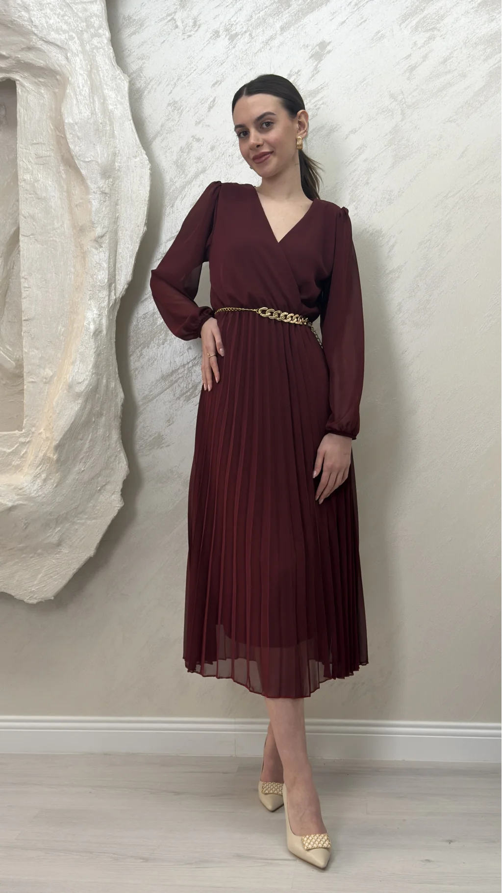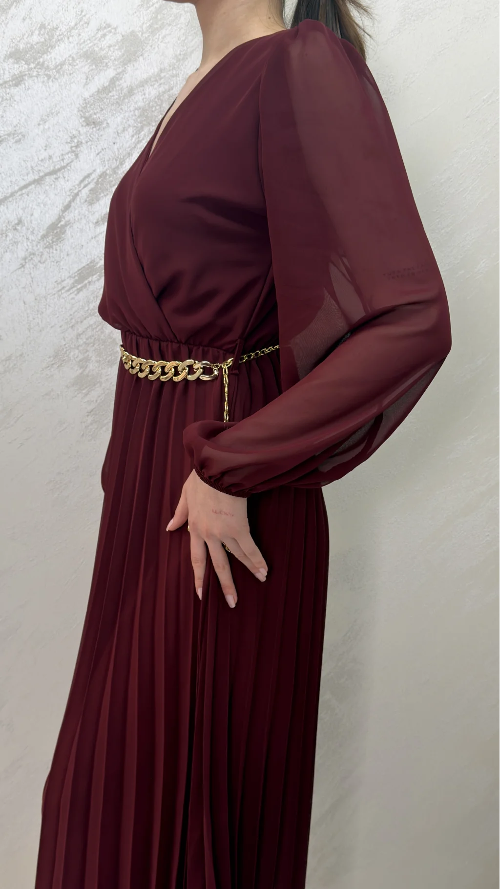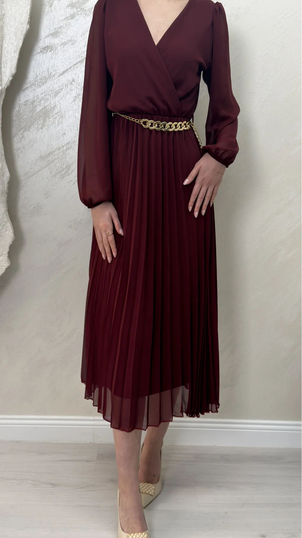 ASTARLI ŞİFON GOLD ZİNCİRLİ MİDİ ELBİSE