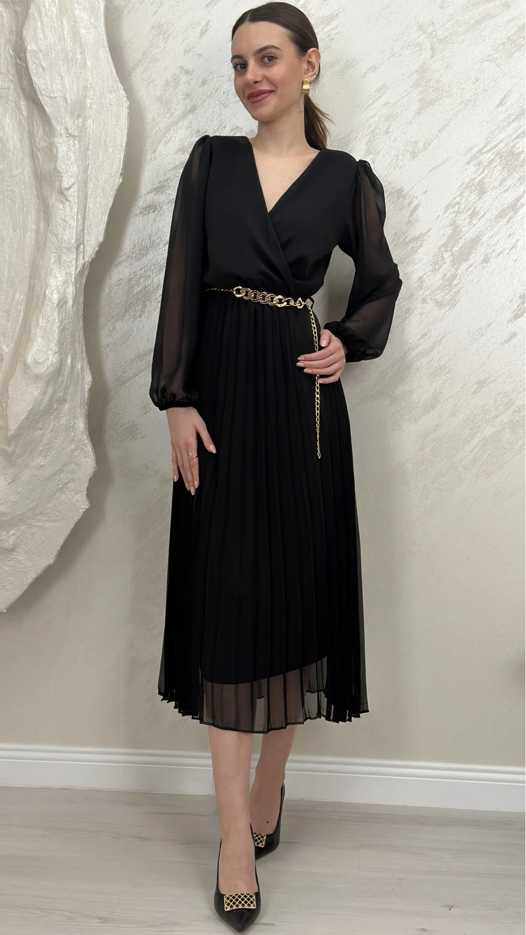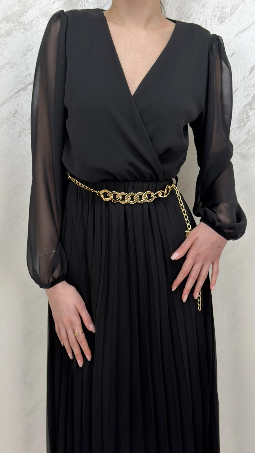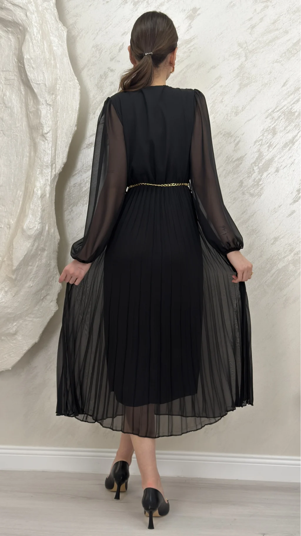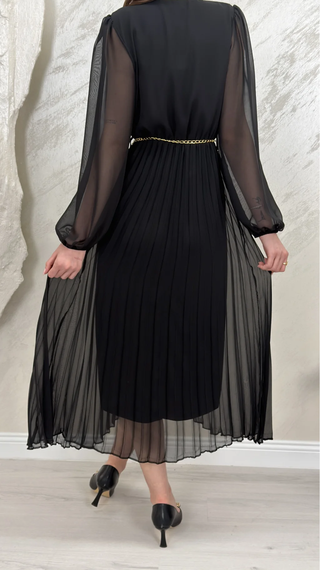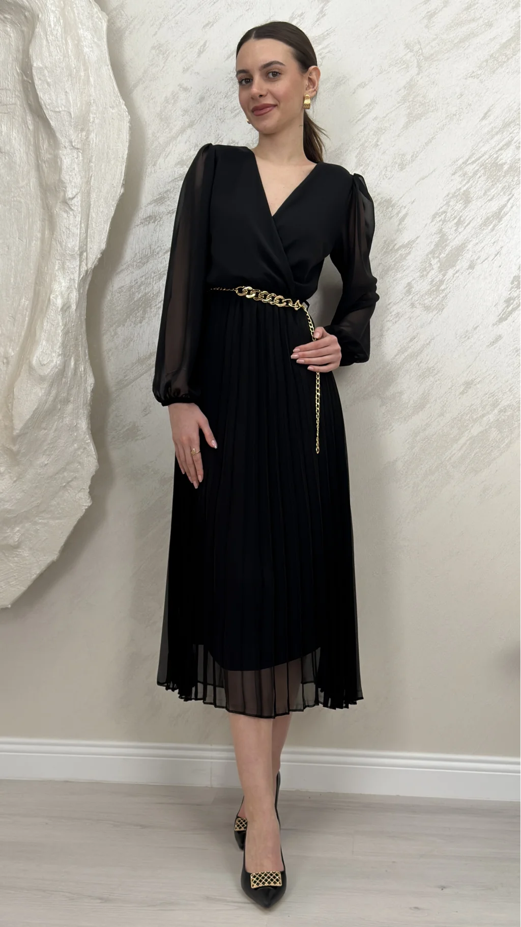 ASTARLI ŞİFON GOLD ZİNCİRLİ MİDİ ELBİSE