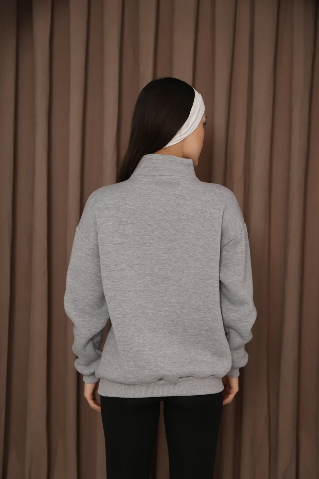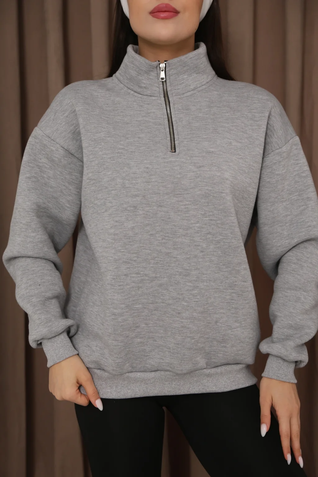 Dik Yakalı Yarım Fermuarlı Üç İplik Şardonlu Sweatshirt