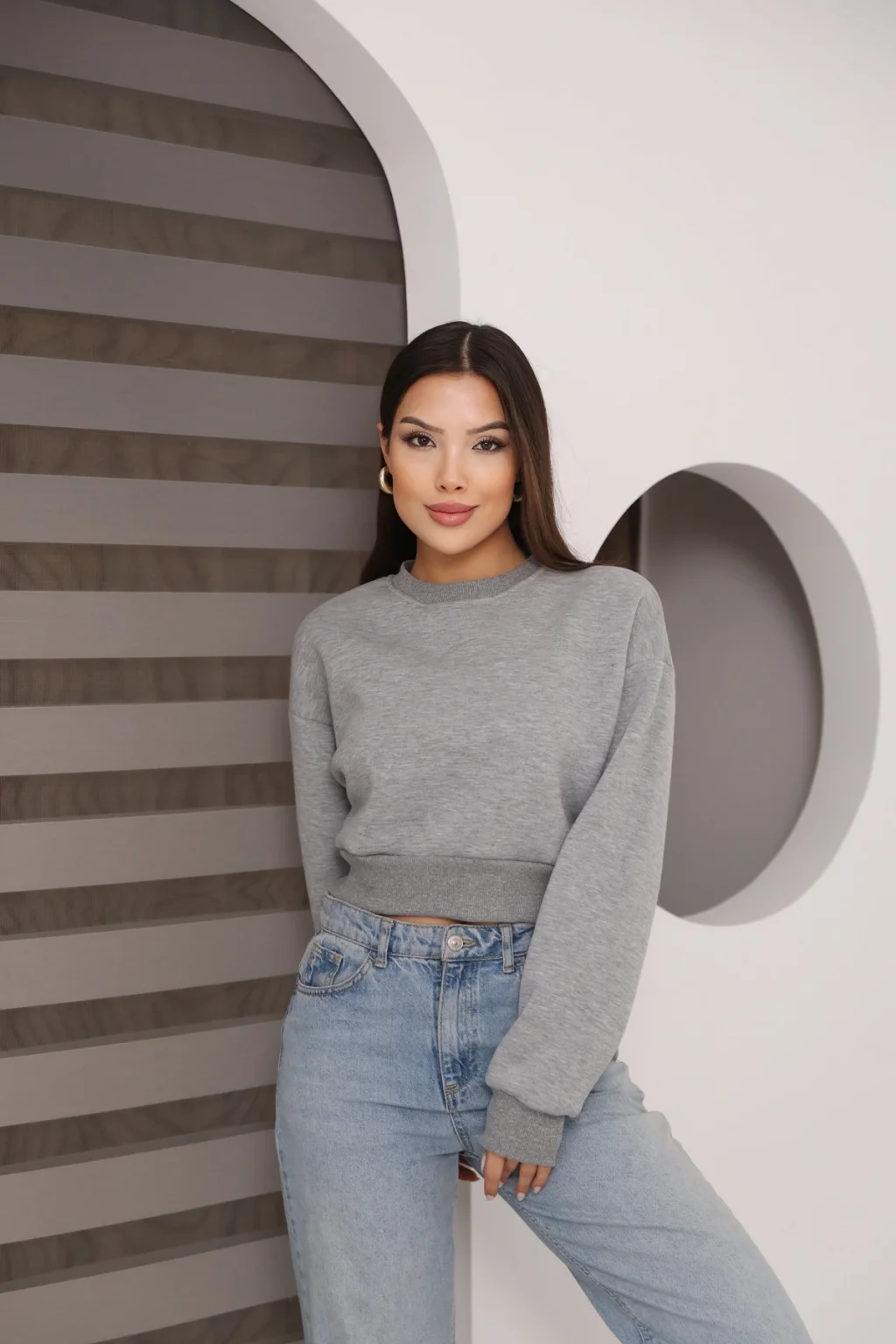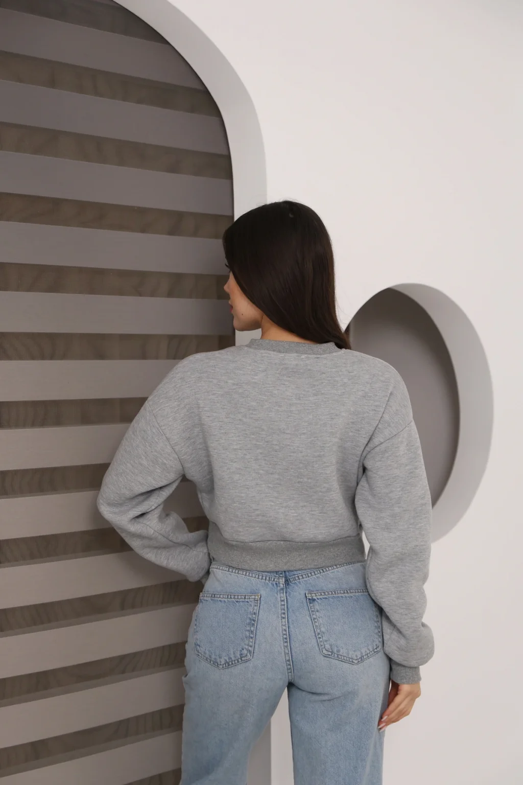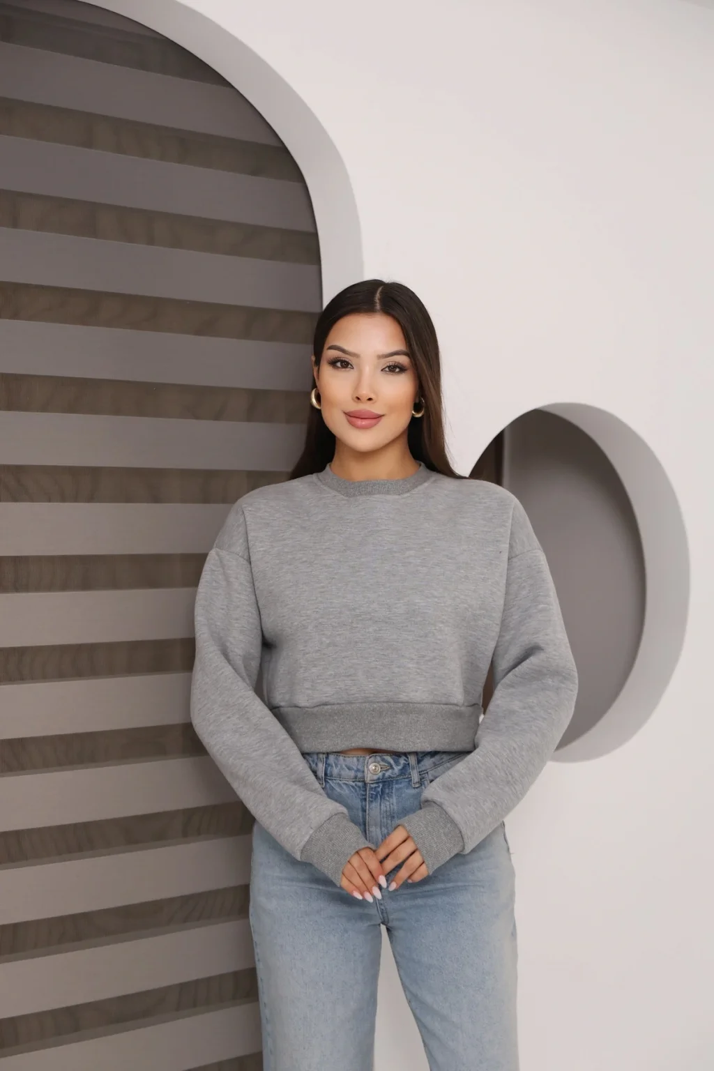 Kadın Üç İplik Şardonlu Oversize Crop Sweatshirt