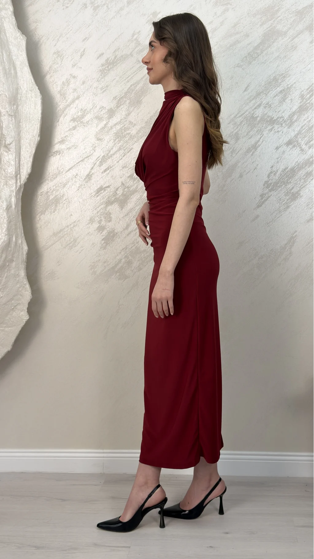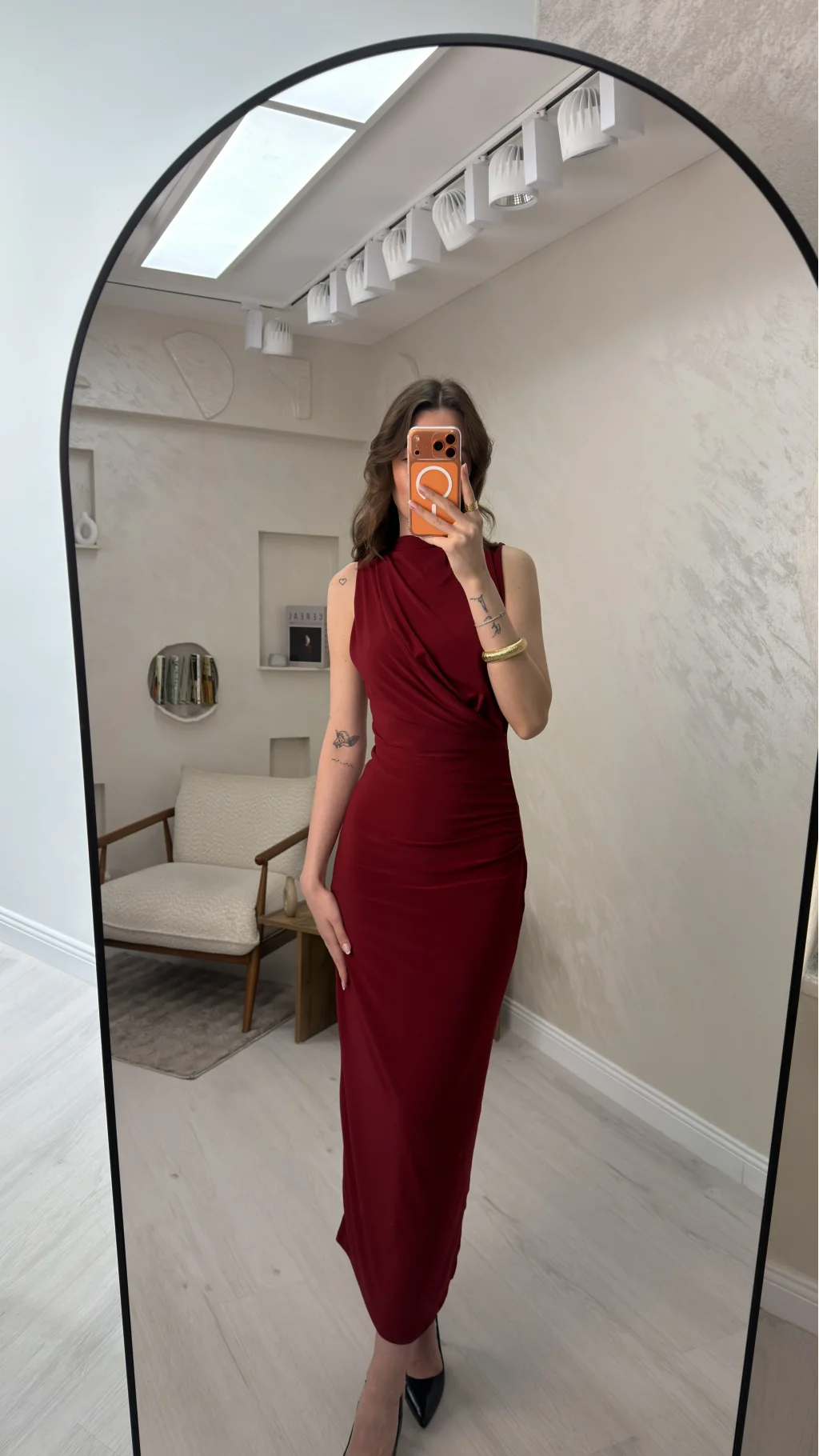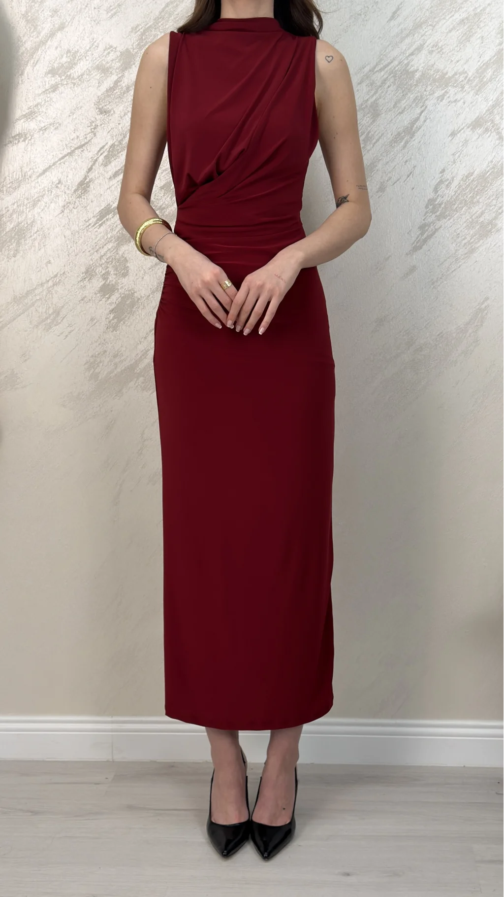 ARKASI YIRTMAÇLI DRAPELİ ELBİSE